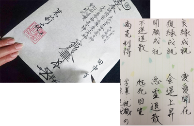 巫女家系で神職の修行を積まれた茉莉花先生の作成する護符はすべて命泉庵のご祈念所に赴くことでご依頼者様の願いが必ずや成就することを一心に祈念しながら「一枚一枚」、「全身全霊」を込めて筆書きしております。護符にはご依頼者様のお名前が書かれる完璧なオーダーメード符となり世界に唯一のものとなります。