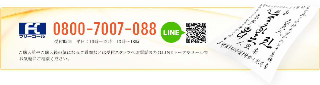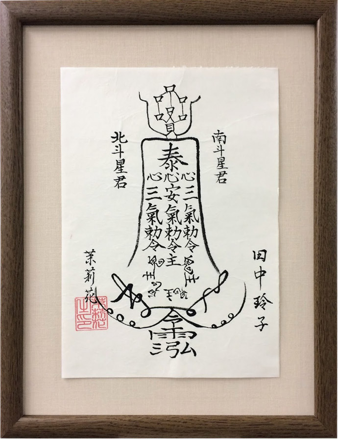 巫女家系で神職の修行を積まれた茉莉花先生の作成する護符はすべて命泉庵のご祈念所に赴くことでご依頼者様の願いが必ずや成就することを一心に祈念しながら「一枚一枚」、「全身全霊」を込めて筆書きしております。護符にはご依頼者様のお名前が書かれる完璧なオーダーメード符となり世界に唯一のものとなります。