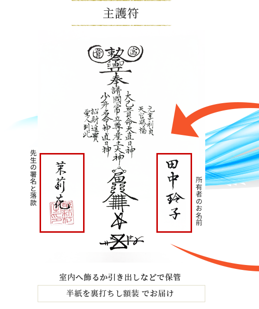 【主】護符を部屋へ飾ることができない場合は、半紙をたたんで引き出し内へ保管して頂いても問題ありません。