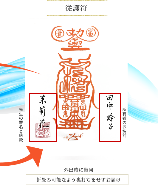 【従】護符は所有者の外出時には帯同して頂くことが理想です。しかし、人に見せたりしますと運気の作用が半減する事がありますのでご注意ください。特にご祈念の対象となる関係者には絶対に見られないようにしてください。